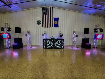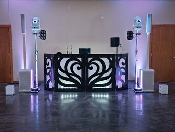 With this setup, you'll get our standard setup with approximately 4-6 standard LED lights, a set of professional speakers, DJ/MC, and a wireless microphone for speeches. One of our team members will be assigned as your DJ, including DJ Adrian (owner.)
